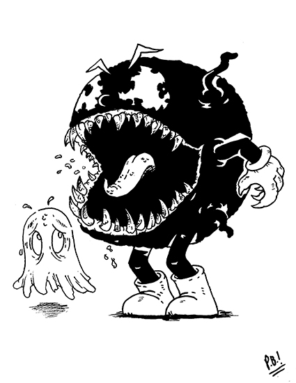 Pac-Man and the Venom symbiote in the mash-up you didn't know you wanted! 4.25" x 5.5" Black and white print.